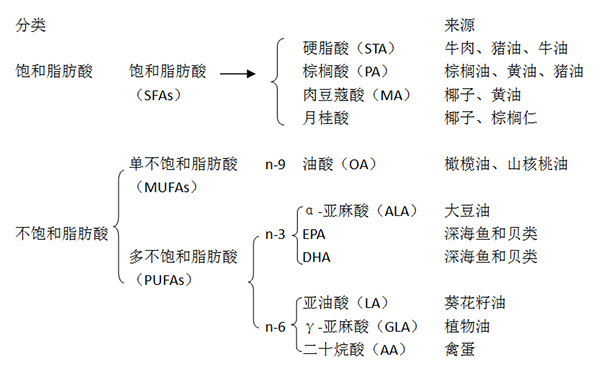 脂肪酸可分为饱和脂肪酸(SFAs)和不饱和脂肪酸(UFAs),不饱和脂肪酸又可以分为单不饱和脂肪酸(MUFAs)和多不饱和脂肪酸(PUFAs)。